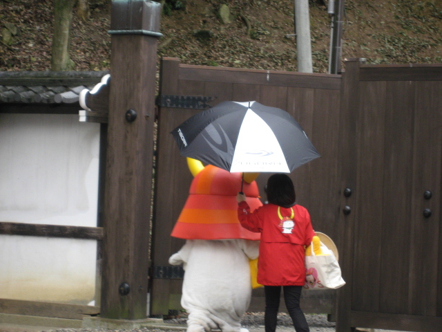 この時間は珍しく雨が降る中博物館前の広場にてモチさん登場。