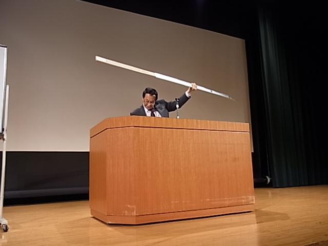 講演の先生の一コマ、戦国時代はこんな大きな刀(正確には太刀と呼ばれるそうです)で戦ったりとか